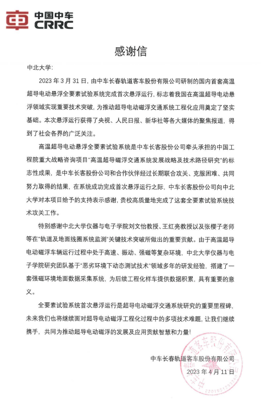 2023年3月31日,由中车长春轨道客车股份有限公司(简称中车长客)研制的国内首套高温超导电动悬浮全要素试验系统完成首次悬浮运行,标志着我国在高温超导电动悬浮领域实现重要技术突破,为推动超导电动磁浮交通系统工程化应用奠定了坚实基础。本次悬浮运行吸引了央视、人民日报、新华社等各大媒体的聚焦报道,得到了社会各界的广泛关注。