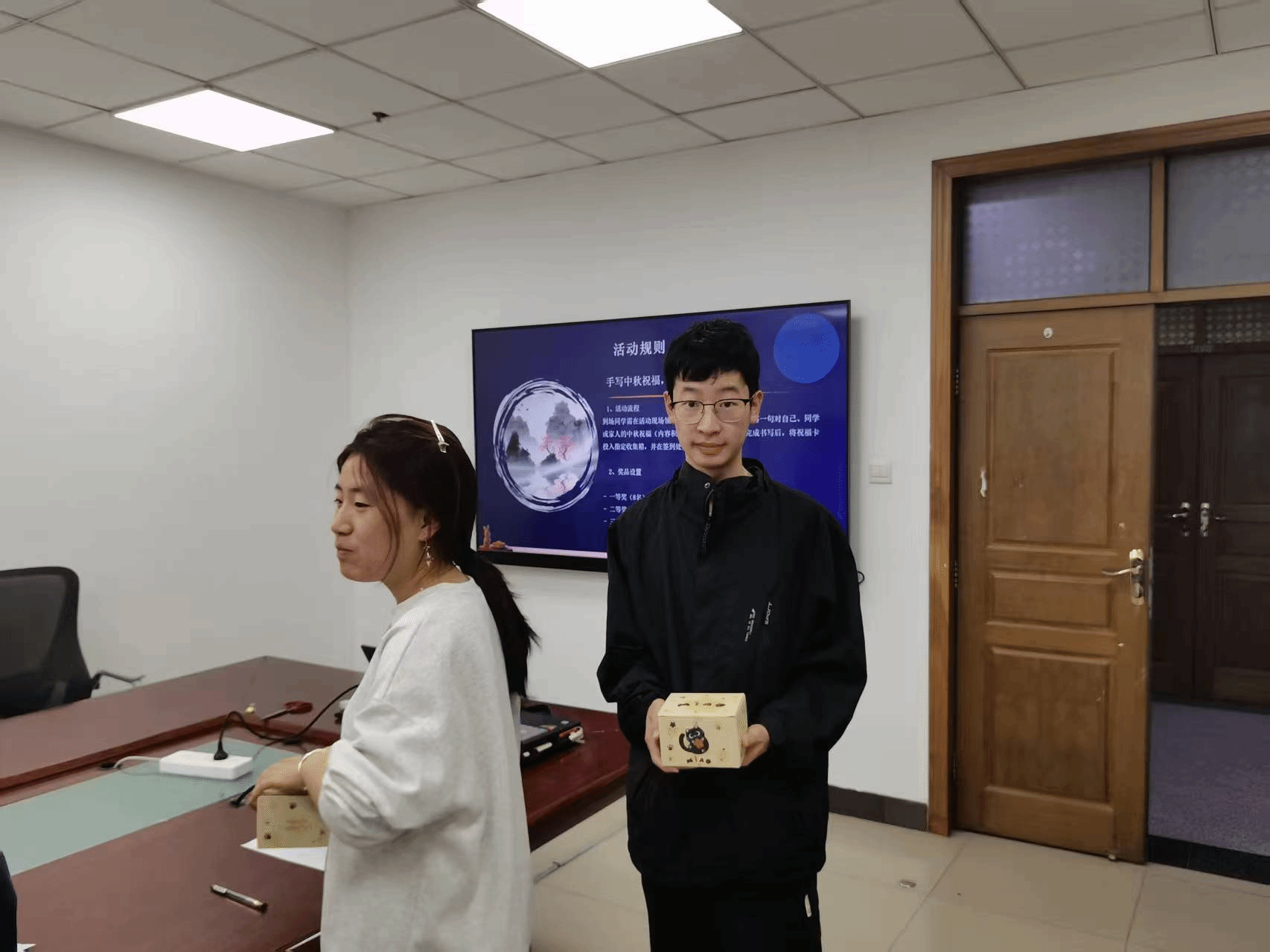 活动现场,老师与志愿者们提前布置好温馨展台,桌上整齐摆放着中秋礼物和手写祝福卡。到场同学先领取专属“中秋祝福卡”,伏案写下对自己的期许、对同学的鼓励或对家人的思念,随后将满载心意的卡片投入收集箱,即可领取抽奖券,参与后续的惊喜抽奖环节。