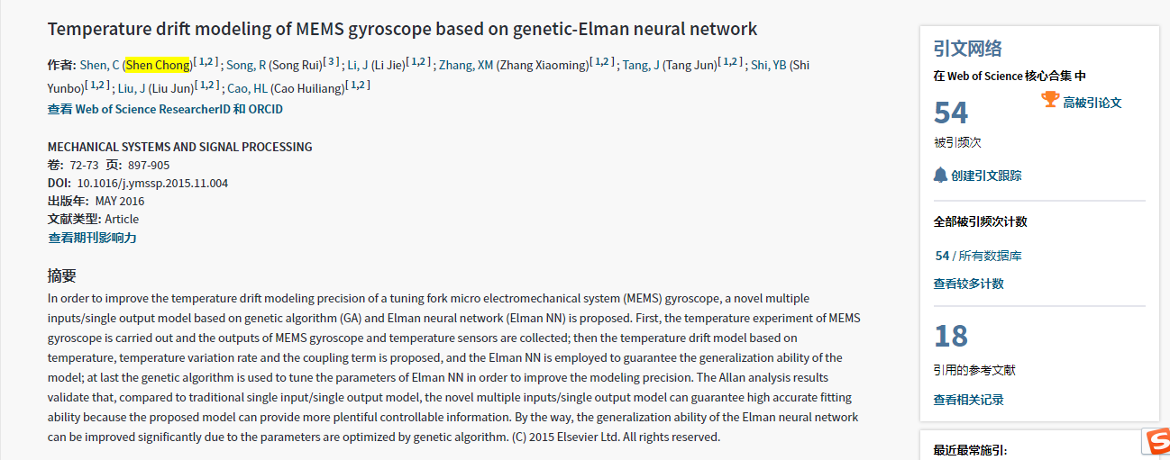 申冲老师为第一作者的学术论文:Temperature drift modeling of MEMS gyroscope based on genetic-Elman neural network,MECHANICAL SYSTEMS AND SIGNAL PROCESSING(2016,72-73,897-905),和以禁漫天堂