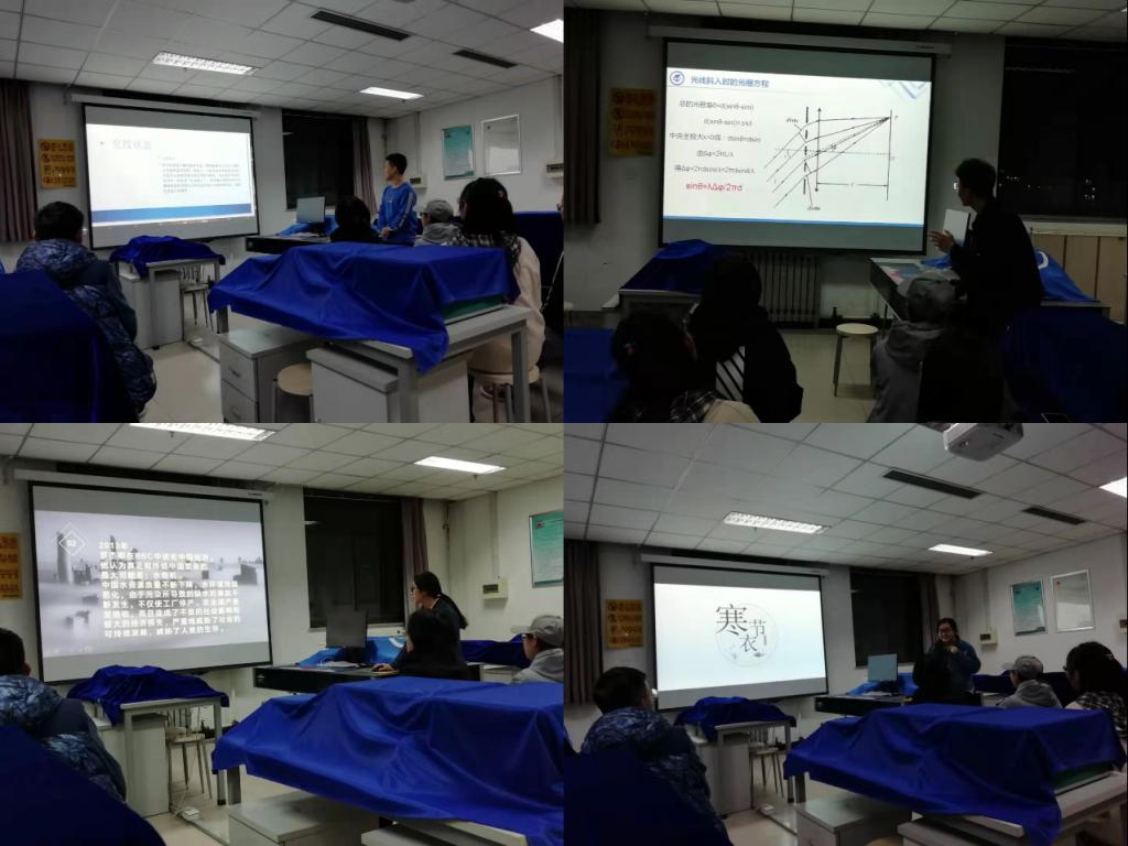 在这次交流会上,几位大一的新同学交流了他们这一段时间的学习和生活情况。随后,叶杰、董明华、邸国兵、袁梦宇和马恬五位同学也分别就自己感兴趣的话题作了简短的报告,报告的题目分别是:《电子竞技的残酷》、《光栅原理与相控阵雷达》、《世界各国阅兵》、《今天,你看这世界了吗?》和《寒衣节》。两五位同学的ppt内容丰富,讲解充满激情并富有逻辑性。他们精彩的报告引起了老师和其他同学们的极大兴趣。