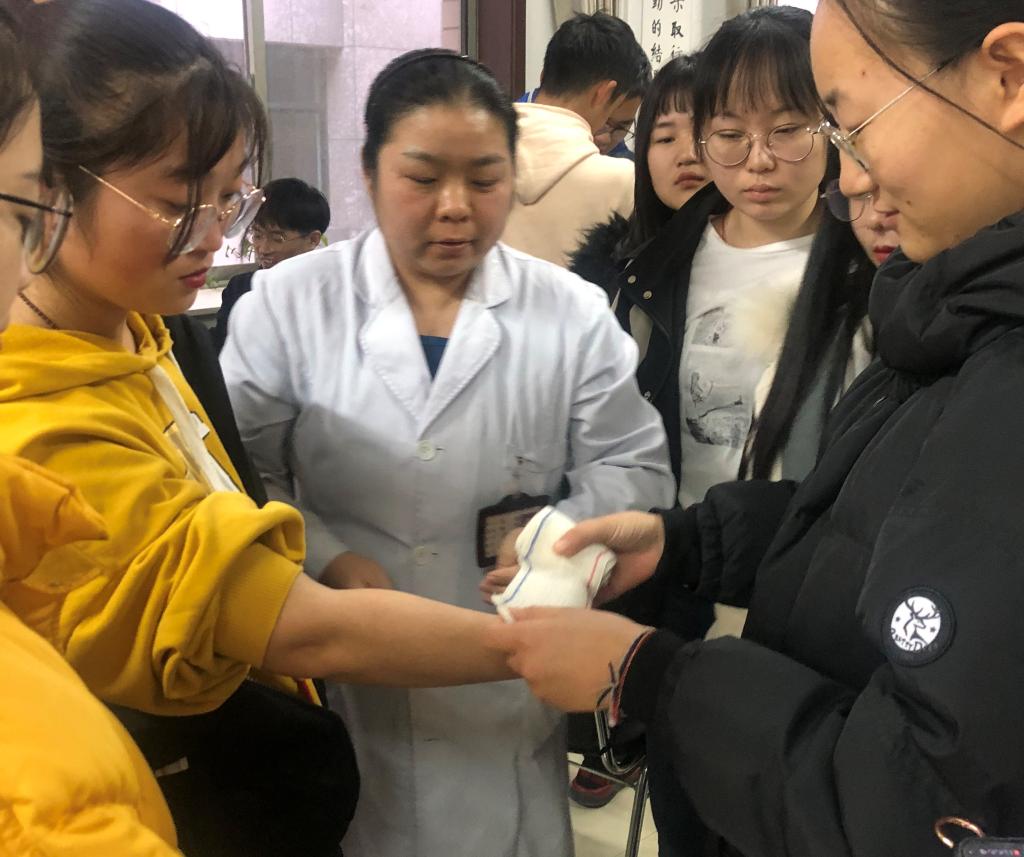 培训中,孙主任首先为同学们介绍了出现不同突发情况导致受伤流血的处理方法,详细讲解和指导演示身体不同部位的止血方法。孙主任介绍的时候,同学们积极跟随他的节奏按压相应穴位,练习止血方法。在理论讲解结束后,由张医生和王医生进行止血方法的现场演示,同学们分为两组,在两位医生的指导下,学习如何正确、快速地包扎手腕、手臂、眼部、头部、手指等易受伤部位的伤口。同学们认真练习,在实践操作中学习包扎技巧,现场气氛热情活跃。