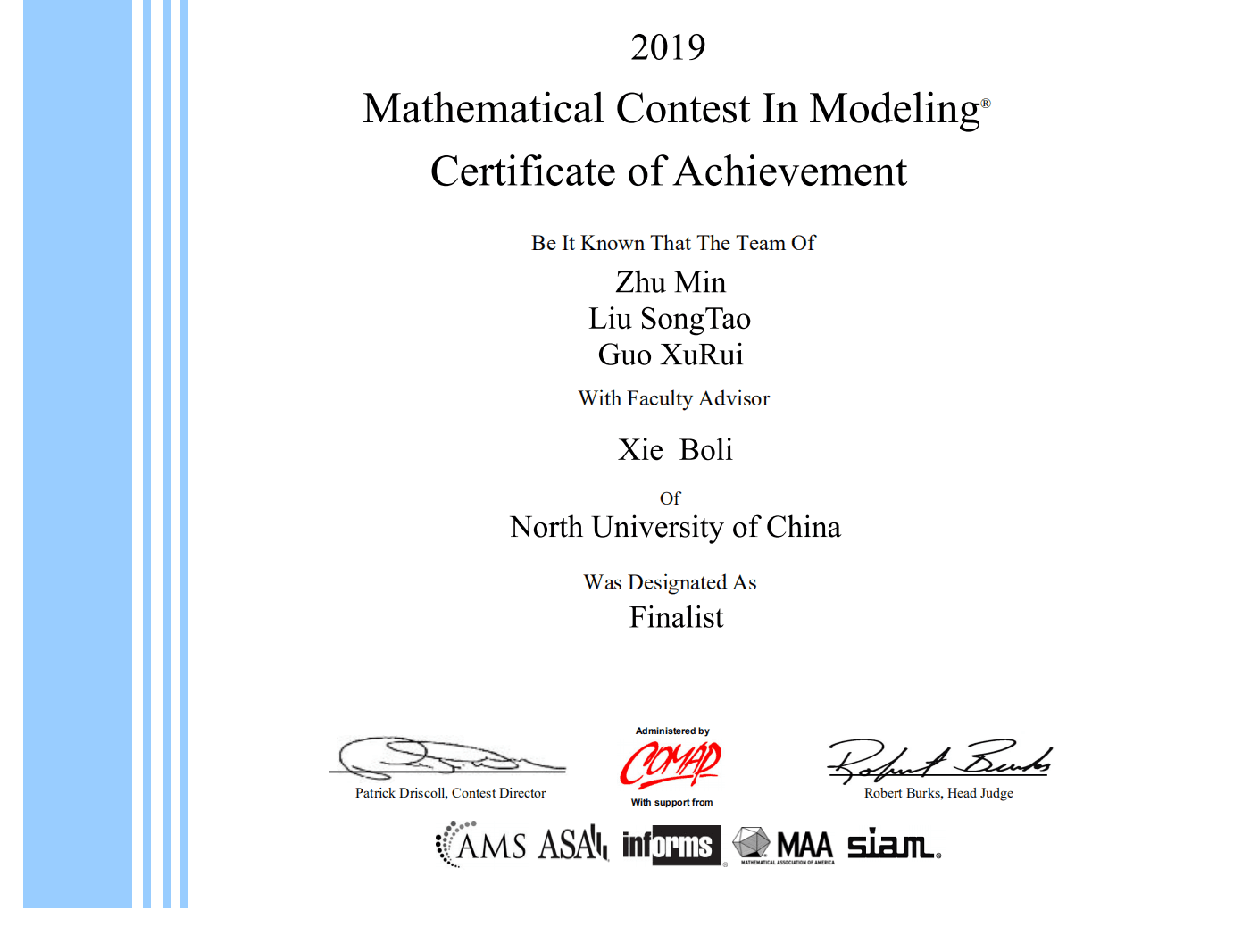 在我所获奖项中,竞争最激烈的是2019年美国大学生数学建模竞赛F奖。美赛是国际性的数学建模竞赛,本次竞赛25370参赛队,F奖及O奖共79组。
