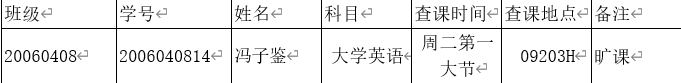 2、请各班班长在查课统计时,认真核实本班情况!一旦确认就视为承认本次查课结果,一切责任由班长负责,若各班因班长未留下来核实而出现误报,责任将由各班班长承担,学风建设部概不负责;本周被误报者请找各班主任反馈给学风建设部相关人员更正。