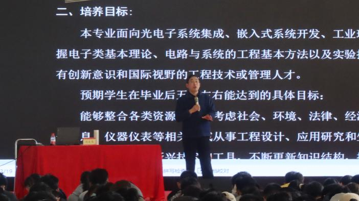的电子科学与技术学科,讲解了本学科的培养目标、专业课程设置、学时(学分)分配以及毕业要求,又从其他多个方面阐述了电子科学与技术学科的优越性。刘院长还向大家介绍了以学生为中心、以成果为导向、持续改进的工程教育认证核心理念。