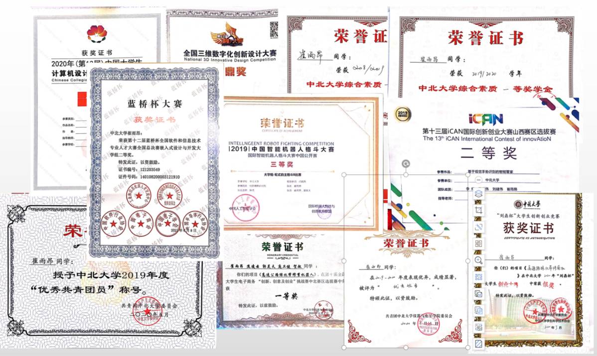 综合素质一等奖学金,连续两年获校、院级优秀团员、一年获优秀班委。学科竞赛方面获国家级奖项两项,省级奖项五项,校级奖项若干。目前已被推免至天津大学微电子学院。
