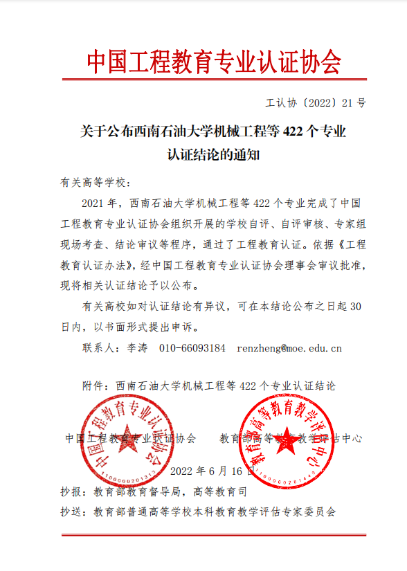 6月16日,中国工程教育专业认证协会和教育部高等教育教学评估中心联合发文《关于公布西南石油大学机械工程等 422 个专业认证结论的通知》(工认协〔2022〕21 号),正式公布了2021年工程教育专业认证结果。本年度共有422个工程教育认证。禁漫天堂