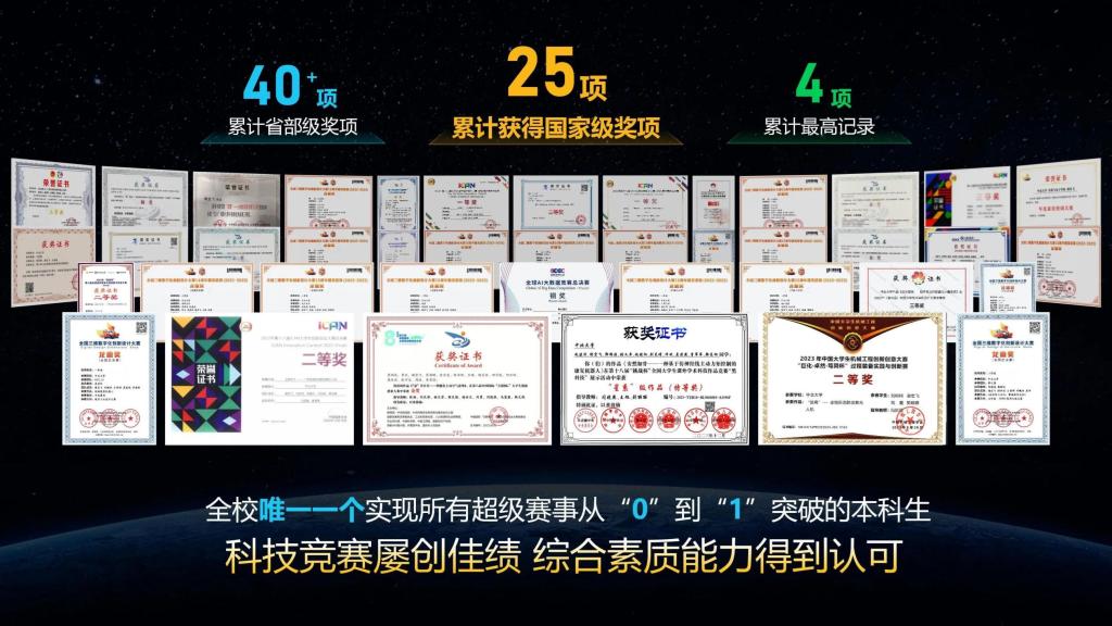 首个超级赛事的最高奖项,实现零的突破。也打破了很多人的一向的固有观念:“最早从大二才能开始做比赛”。随后便在做中学,在学中做,积极参加各级各类赛事,也纷纷结出硕果,获得25项国家级奖项,40余项省部级奖项,申请国家专利6项,软著2项。