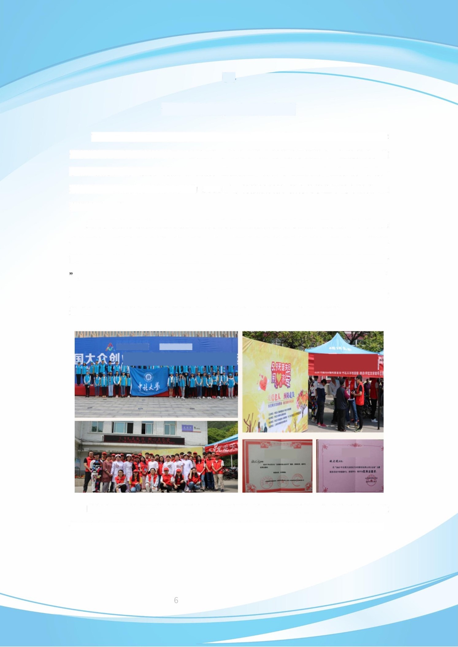 此外,积极参加社会志愿服务工作,为社会奉献自己的光和热。曾参加“中华人民共和国第二届青年运动会”志愿服务工作,“无走失日黄手环关爱老人活动”、“世界献血日献血活动”“自闭症儿童康复户外训练活动”“太原图书馆长期文化志愿服务、“壹基金”温暖包志愿活动等等,曾获得“五四青年登山音乐节”优秀志愿者,“ 2018年全国大众创业万众创新活动周山西分会场”会场优秀志愿者。2019年7月,受邀成为中华人民共和国第二届青年运动会火炬手,传递希望,为运动喝彩!