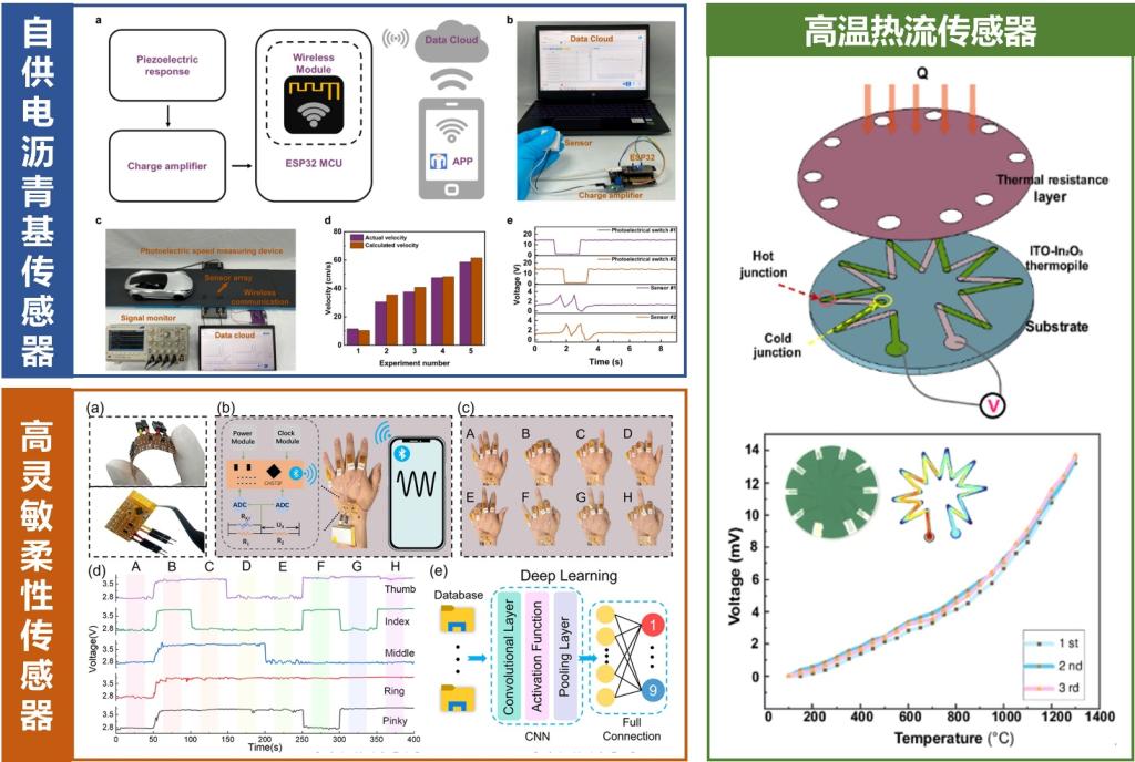 在无线无源传感技术方面:硕士研究生何浩赟的学术论文《Self-powered asphalt-based sensors for smart roads》(通讯作者谭秋林教授、清华大学臧浠凝教授)发表于Nano Energy(IF:16.8, 中科院一区Top期刊),该研究通过在沥青基质中引入压电材料构建功能化复合体系,成功开发出兼具传感与能量收集功能的自供电沥青基传感器,为智能道路系统提供了低成本、高兼容性的解决方案。硕士研究生张晓海的学术论文《Facile preparation of porous MXene/cellulose nanofiber composite for highly-sensitive flexible piezoresistive sensors in e-skin》(通讯作者谭秋林教授、张磊副教授)发表于Chemical Engineering Journal(IF: 13.3,中科院一区TOP期刊),该研究通过真空过滤结合酸碱中和反应法构建了表面斑状凸起与多孔结构协同增强的MXene/纤维素纳米纤维复合体系,成功开发出高灵敏度柔性压阻传感器,为电子皮肤、医疗诊断及人机交互领域提供了高性能柔性传感解决方案。青年教师董和磊的学术论文《High temperature heat flux sensor with ITO/In2O3 thermopile for extreme environment sensing》(通讯作者谭秋林教授)发表于Nature出版集团旗下的Microsystems & Nanoengineering(IF:7.3,中科院一区TOP期刊),该研究设计制备了一款陶瓷基高温热流传感器,有效提升了复杂环境下的耐温性和电势输出。