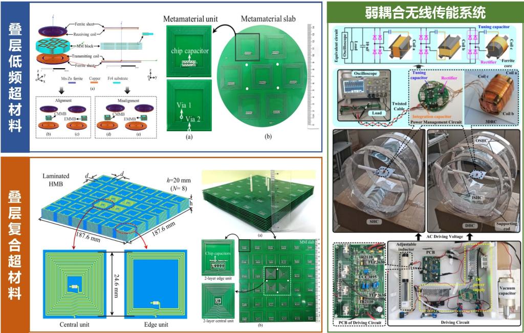 在无线供能技术方面:博士研究生马宏帅的学术论文《Laminated miniaturized low-frequency metamaterial block for near-Field wireless power transmission applications》(通讯作者谭秋林教授)发表于IEEE Transactions on Antennas and Propagation (IF: 4.9, 中科院一区TOP期刊),该研究提出了一种叠层低频超材料及其相对磁导率的计算方法,解决了超材料应用于低频近场无线电能传输领域时存在尺寸过大以及常规全波仿真法中的波端口与边界限制难题;该生的另一篇学术论文《Laminated hybrid metamaterial block for enhanced efficiency and SNR in simultaneous wireless power and signal transmission system with dual-sided LCCL compensation networks》(通讯作者谭秋林)发表于IEEE Transactions on Power Electronics(IF:6.6,中科院一区TOP期刊),该研究提出了一种具有负磁导率与近零磁导率特性的叠层复合超材料,实现了对低频准静混合磁场的同步调控,有效提高了无线电能与信号同步传输系统的远距离传输性能。青年教师高晋阳的学术论文《Design and Optimization of a Novel Double-Layer Helmholtz Coil for Wirelessly Powering a Capsule Robot》(通讯作者谭秋林教授、高晋阳副教授)发表于IEEE Transactions on Power Electronics(IF:6.6, 中科院一区TOP期刊),该研究提出了一种基于双层亥姆霍兹发射线圈的弱耦合无线传能系统,实现了交变磁场均匀性和传能效率同步提升。
