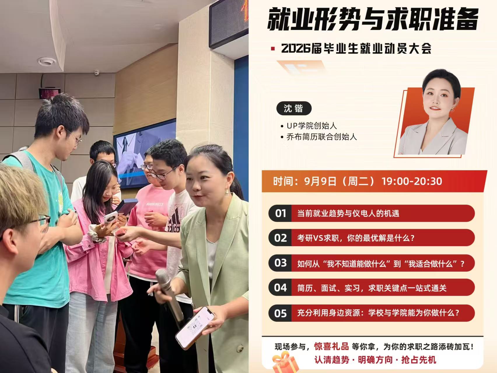 就业指导环节,学院特邀UP学院创始人、乔布简历联合创始人沈锴老师作专题讲座。她分析了当前就业形势,指出学院三个专业在先进制造、集成电路等领域需求旺盛,建议同学们明确职业定位,提前准备、积极实践。沈锴还介绍了“双线并行”“定向+海投”等求职策略,提醒同学们把握“金九银十”招聘季,主动争取就业机会。