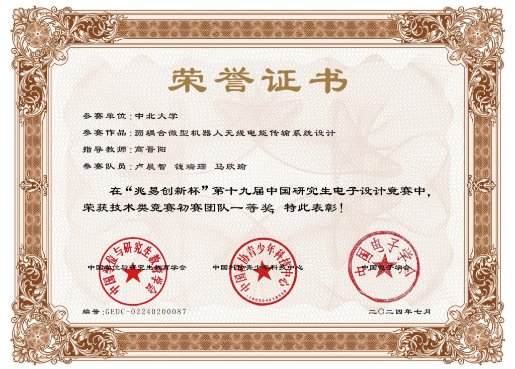 学业二等奖学金。研究方向为面向胶囊机器人的无线供能技术。研一下学期通过学校和学院相关文件了解到研电赛。经过与导师交流并得到导师支持后,便与团队成员钱瑞琛、马欣瑜积极备赛。团队参赛作品——弱耦合微型机器人无线电能传输系统设计,关注人民生命健康,旨在解决胶囊内镜供能问题的发展痛点,推动我国胃肠微无创诊察发展。在高晋阳导师的指导下,依托课题组多年研究成果,作品形成了具备电磁安全性发射线圈优化模型、具备温升安全性的有限空间接收线圈优化模型和机载新型电能管理电路三大创新点。在山东大学(青岛校区)华北赛区技术赛现场赛阶段,从华北地区48所高校的596支队伍脱颖而出晋级全国总决赛。