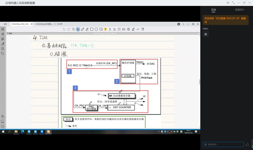 本次培训的主讲人为雷喜骏,主要内容为对stm32定时器(中断、PWM、输入捕获)的讲解。首先,雷喜骏通过框图的形式,对基本定时器、标准定时器、高级定时器进行讲解,使得同学们能够初步了解定时器的大体框架与基本原理。之后,雷喜骏为大家讲解定时器如何配置与注意事项,并着重讲解定时器配置的基本结构。最后,雷喜骏通过示例程序为大家演示如何配置结构体,使得同学们能够在实践中对定时器有更深的了解。
