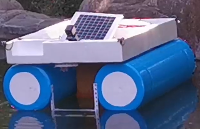 制作了一种多功能湖面清洁装置。包括捕捞船和垃圾桶两部分。对垃圾分两步进行收集:第一步,捕捞船在湖面上自动巡检,树莓派识别到存在的垃圾后,将垃圾坐标信息通过串口通信发送给STM32单片机,单片机使用PID算法对船身控制,调整船舱口正对垃圾,将垃圾收入舱内,收集满后送入指定位置。第二步,在船和垃圾桶的配合下,垃圾桶的铲斗在丝杠电机和舵机的共同作用下顺利将垃圾倾倒入桶内。