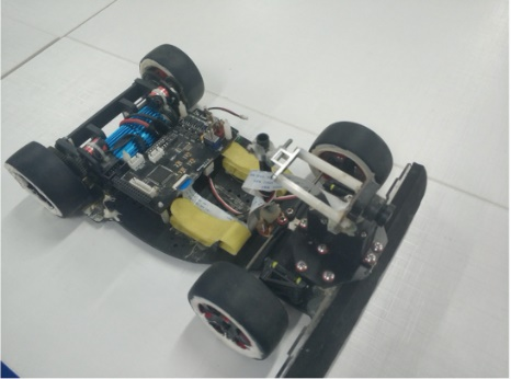 该小车通过车载摄像头以30HZ频率捕捉车辆前方的道路信息,经由数字滤波,阅值划分,二值化处理等步骤,提取前方道路的二值化图像。之后,车载的MK66系列单片机通过对二值化图像进行中线提取和斜率拟合,实时判断车辆需要的偏转方向并使用PID控制器对舵机转向结构加以控,使车辆可以在道路中高速行驶。