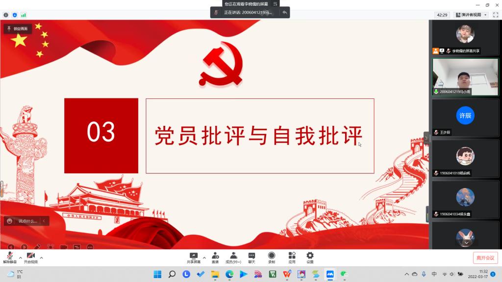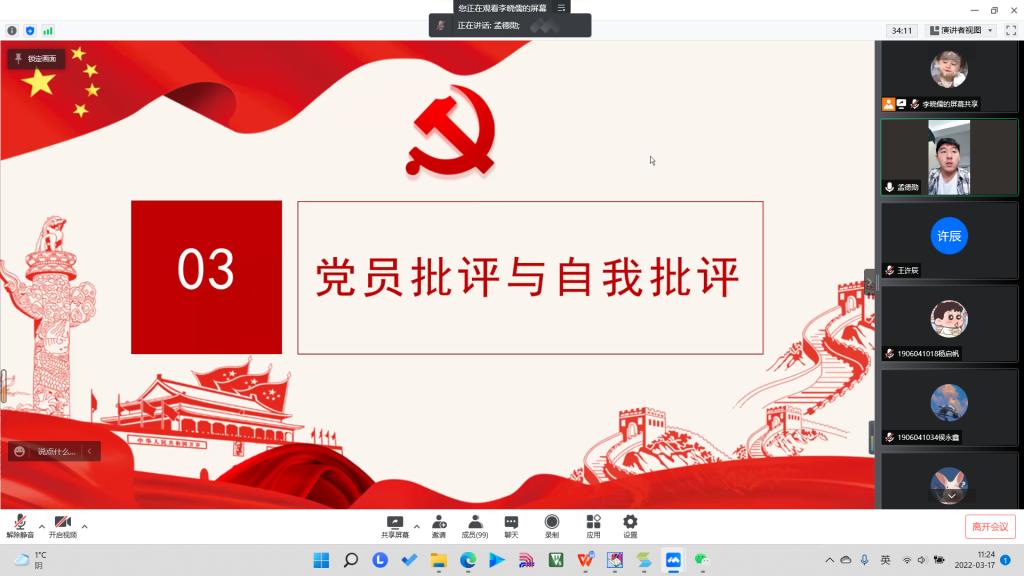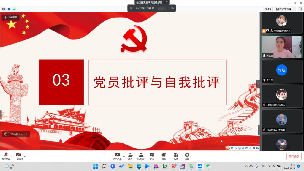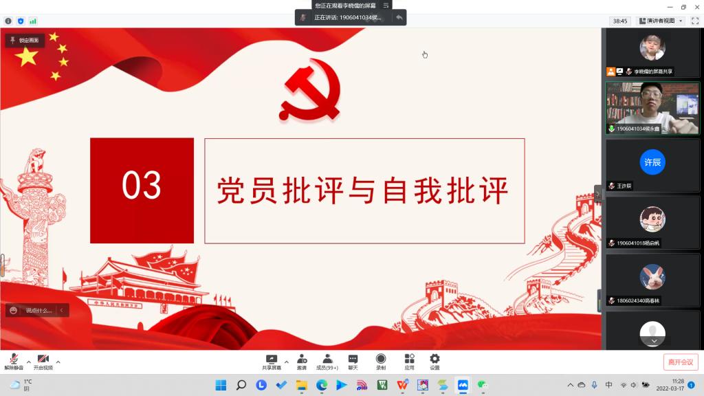 会议第三项,党小组派党员代表依次发言,开展了积极诚恳的批评与自我批评。中共预备党员汤晨晨反思自己学习理论不够全面,不够透彻。并表示在今后首先要深化学习党的理论知识,在实中干,在干中学。中共预备党员郝焰莹杰从思想上、学习上、工作上方面详细地指出了自己存在的问题,不擅长平衡学习与课余生活,没有在应该的时间把握好学习的重心,并结合自身实际提出了对自己的新要求,列出了整改措施。中共预备党员侯永鑫主要剖析了自身对于党的知识的欠缺。中共预备党员孟德勋和苗云鸿反思了自己在班委工作中,对身边的同学没有足够的关心,没有做到积极帮扶身边的群众,带领学生群众前进的能力不强。