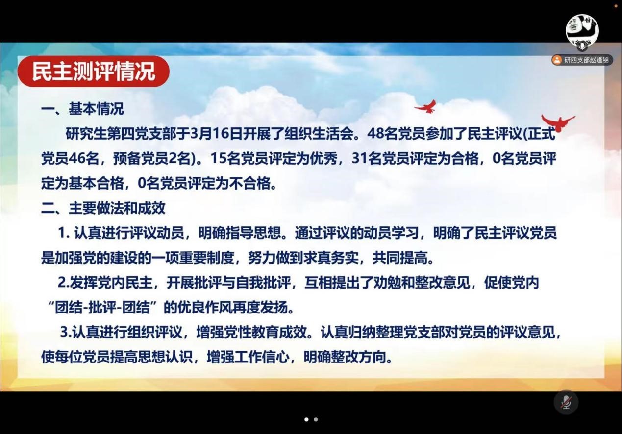 研四支部于3月16日在线上召开组织生活会以及开展民主评议党员的重要会议,会议深入学习贯彻习近平新时代中国特色社会主义思想,学习贯彻党的十九届六中全会精神,学习贯彻省第十二次党代会精神。