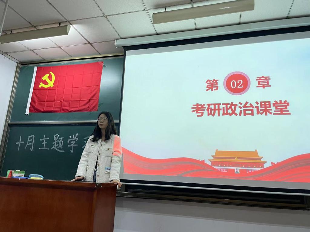 随后,党支部预备党员张安雯,郭宝泽对分享“考研政治”相关知识点。张安雯从民营经济入手,着力于“三个没有变”“两个毫不动摇”,对民营经济存在的问题进行分析,接着引用习近平总书记在全国生态环境保护大会上的重要讲话,对生态环境保护和经济发展辩证统一以及绿水青山就是金山银山提出了自己的理解。郭宝泽从党的成立条件与党史重要事件两方面入手,为同学们讲解中国共产党成立到中华人民共和国成立之间的历史。