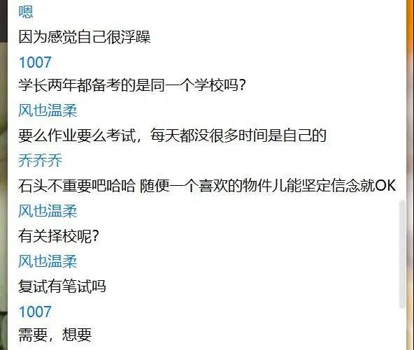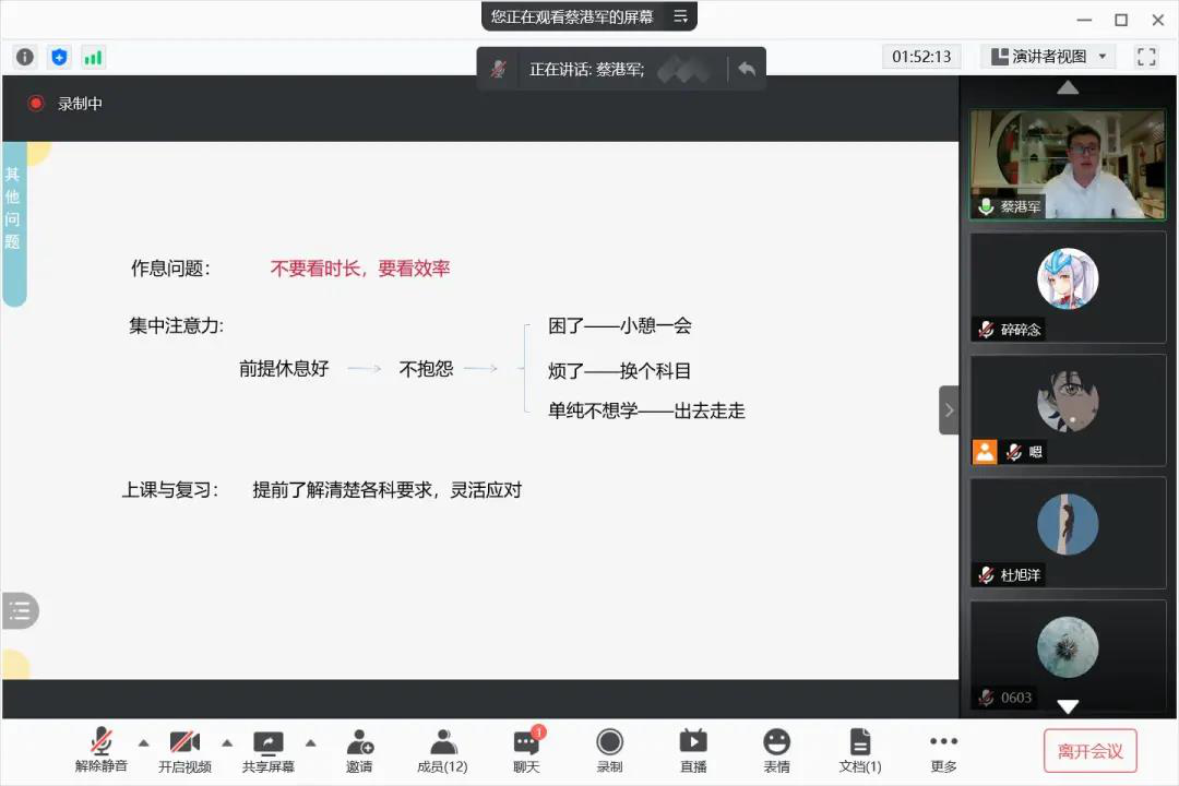 会议在晚7时三十分准时开始,考研至浙江大学的蔡港军学长率先开始了自己的考研经验分享。学长从选专业、学校,各科的复习,其他诸如考研备战期间生活方面等问题结合自己的经验细致入微地给准备考研的同学提出了建议。长风破浪会有时,直挂云帆济沧海。在谈及专业、学校的选择时,他建议同学们有梦想可以去追求,同时也要做好失败的心理准备。学长在分享中着重介绍了自己在数学的四轮复习中所用的方法,并贴心地分别举例加以阐明。针对备考期间的作息、专注、心态等问题,蔡港军学长认为备考期间重在效率,不能只重量而不重质,时常进行自我激励保证自己心态的同时也是在保证自己的复习效率。在分享的最后,蔡港军学长一一解答了同学们有关专业课、考研机构的选择等问题。蔡港军学长的分享细致而全面,给尚处迷茫之中的考研同学带来了一个可以选择的方向。