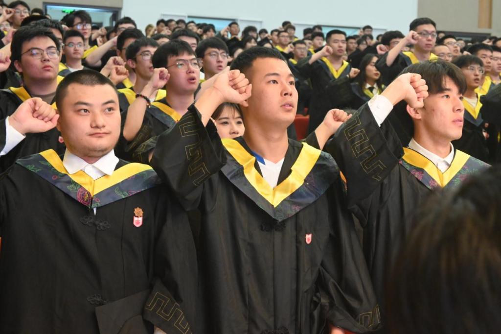 博士生代表黄小东和本科生代表侯帅鹏依次做毕业生代表发言,回顾了他们的校园生活与学习经历,同时立足当下,规划未来。接着,第二十六届研究生支教团谢晓峰领读毕业生宣言,大家以铿锵有力的声音在一句句誓言中道出对母校的感恩,对时代的担当。