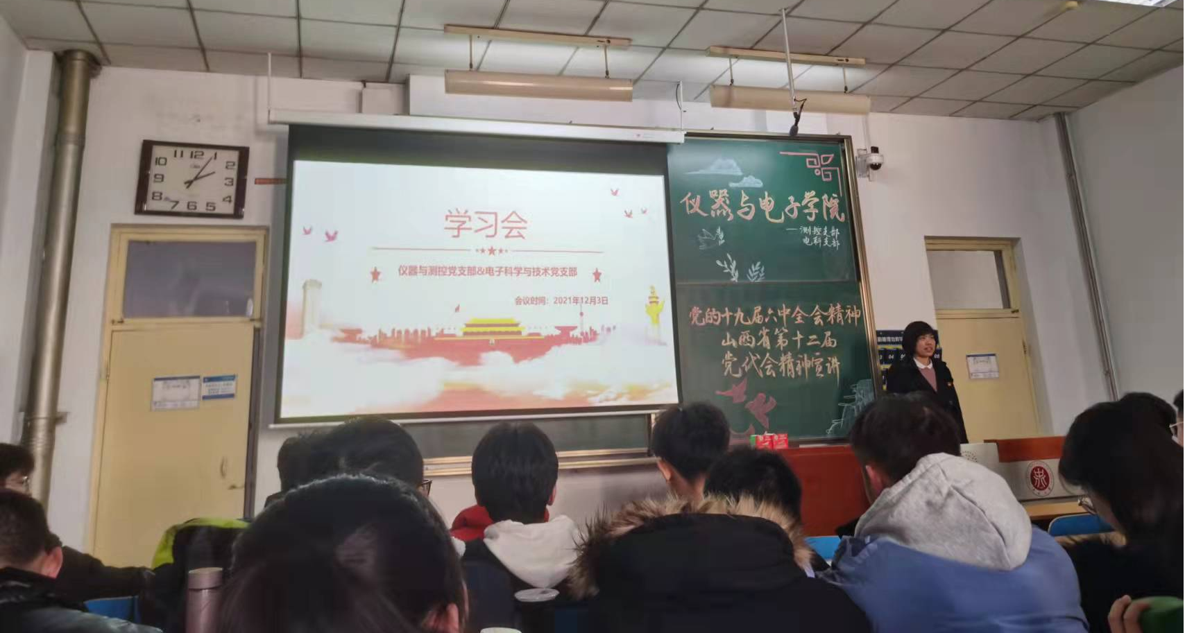 2021年12月3日,仪器与测控党支部与电子科学与技术党支部于11306H召开“党的十九届六中全会精神及山西省第十二届党代会精神”宣讲会,宣讲人为禁漫天堂